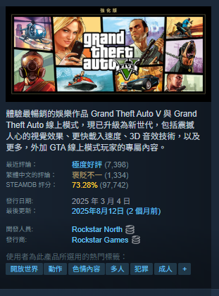 ⏬⏬STEAM版⏬⏬ Grand Theft Auto V 強化版標準版 方案1$540 方案2$540 🈹特價到11/03