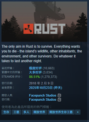 ⏬⏬STEAM版⏬⏬ Rust標準版 方案1$450 方案2$400 🈹特價到11/06